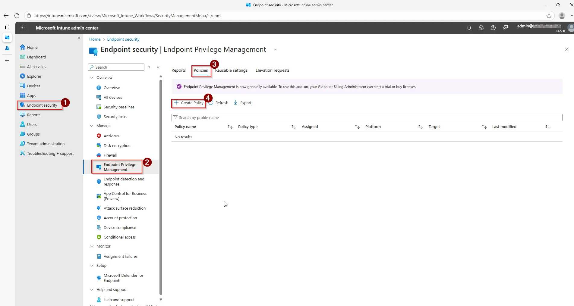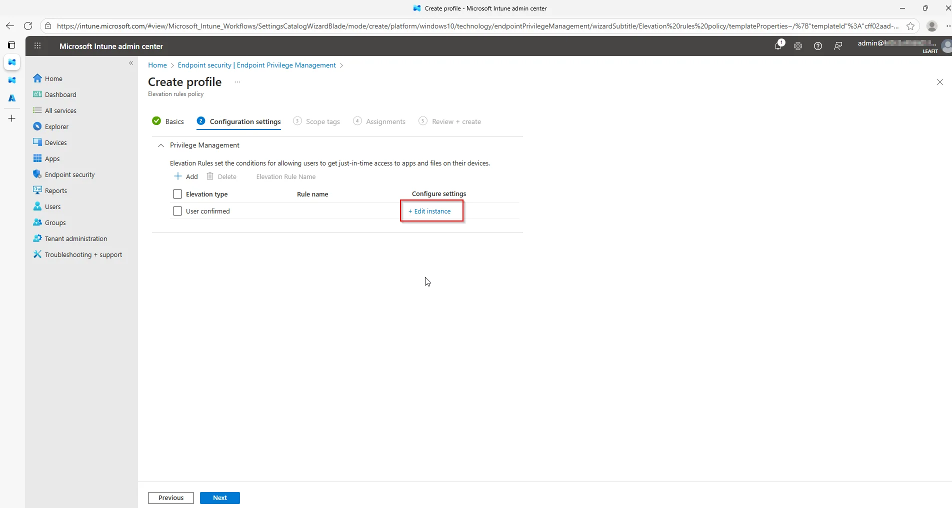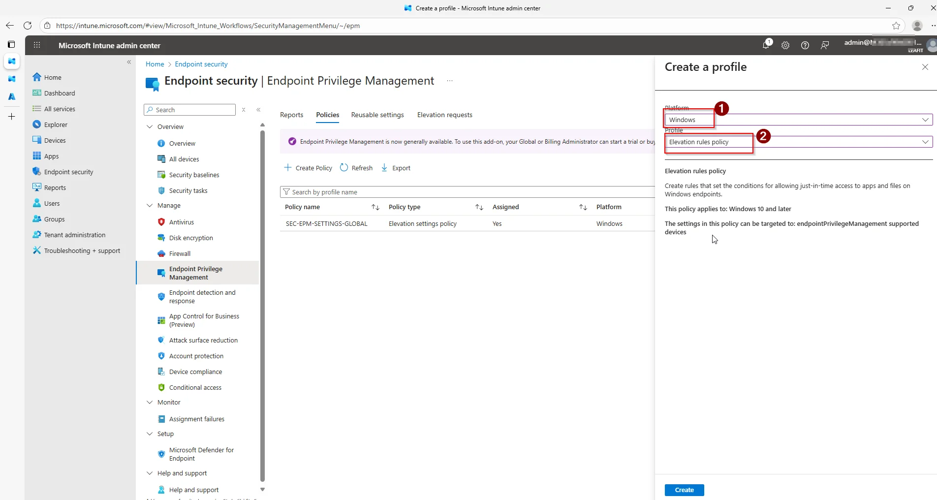 I start of in Microsoft Intune, where I navigate myself to the âEndpoint securityâ-blade. It is here we will find âEndpoint Privilege Managementâ. Where we will go to âPoliciesâ and have the option to create a new âElevation rules policyâ.
