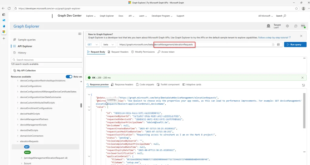 Through the Graph Explorer, you can easily check the date under âdeviceManagement/elevationRequestsâ.