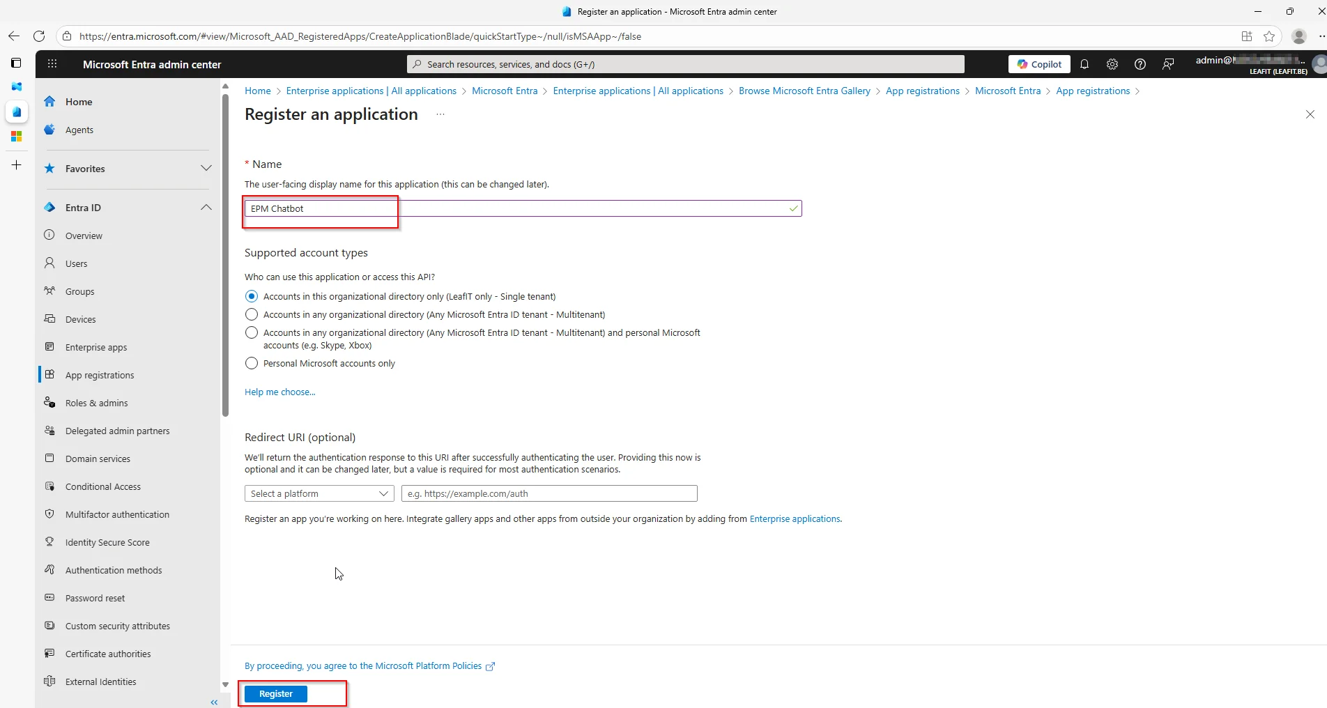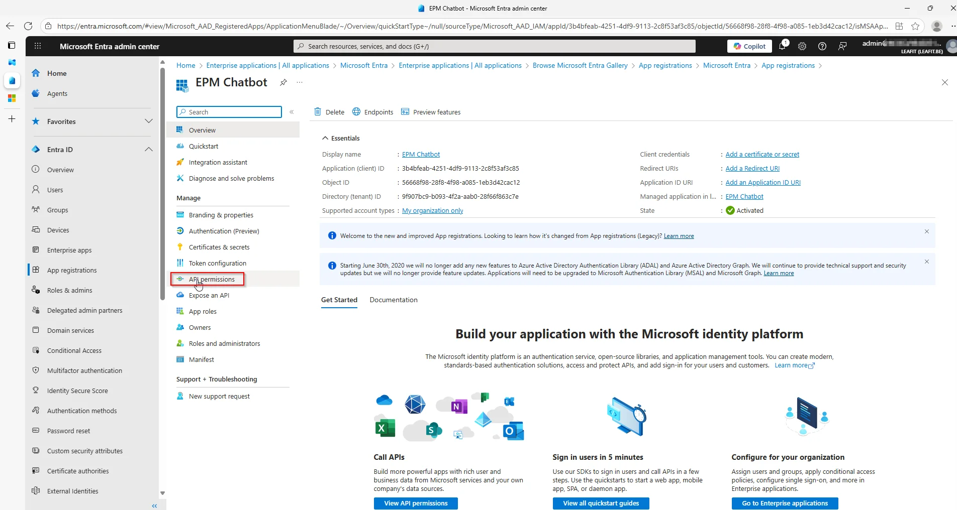 Creating an app registration is quite easy, but will allow us to grant these permissions there and not have to worry about authentication in our EPMChatbot.