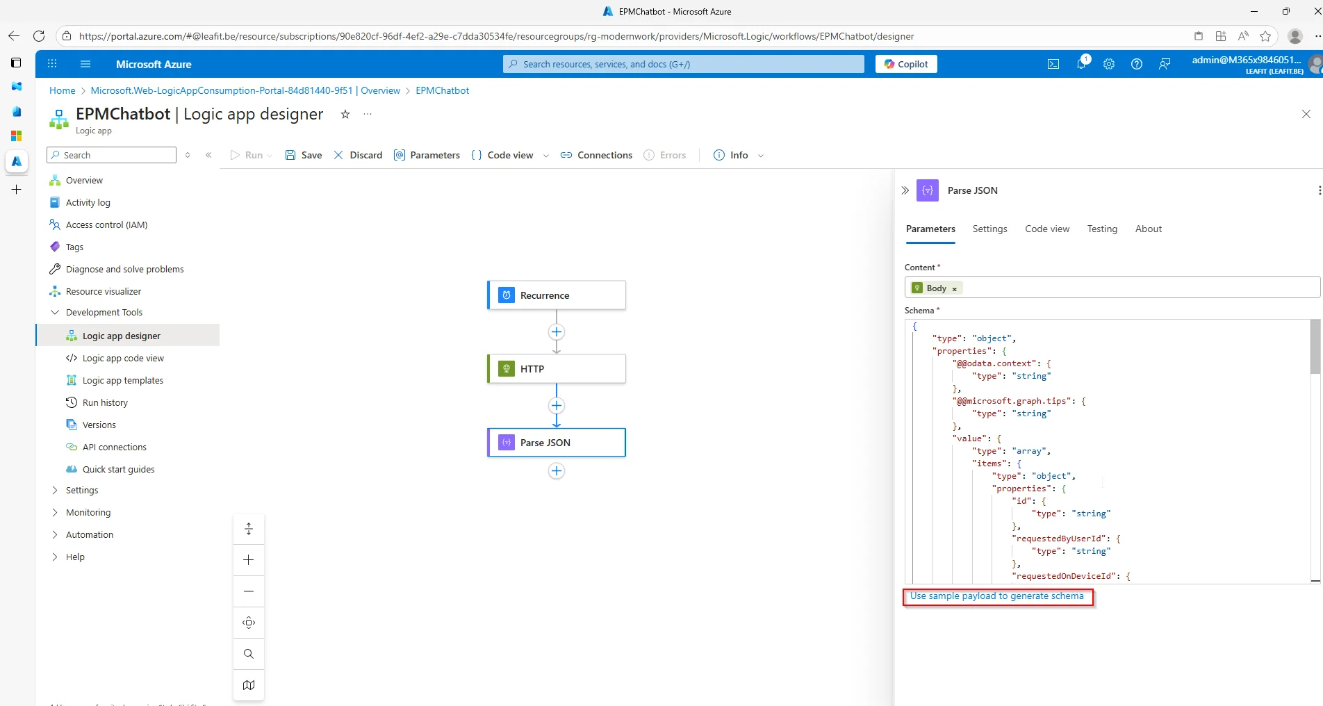 Afterwards, we will Parse the JSON that is in the Body of our HTTP request. Here you can use the âUse sample payload to generate schemaâ option. Creating the schema for the JSON can be tedious task. By using the example output from our Graph Explorer test, we can do this in a heartbeat. Finally, we will use the âPost message in a chat or channelâ-option from the Teams connector. You can see there are quite a few options like the UserPrincipalName, file name and so on. We have just used a minimum in this demo to make sure everything works as it should.
