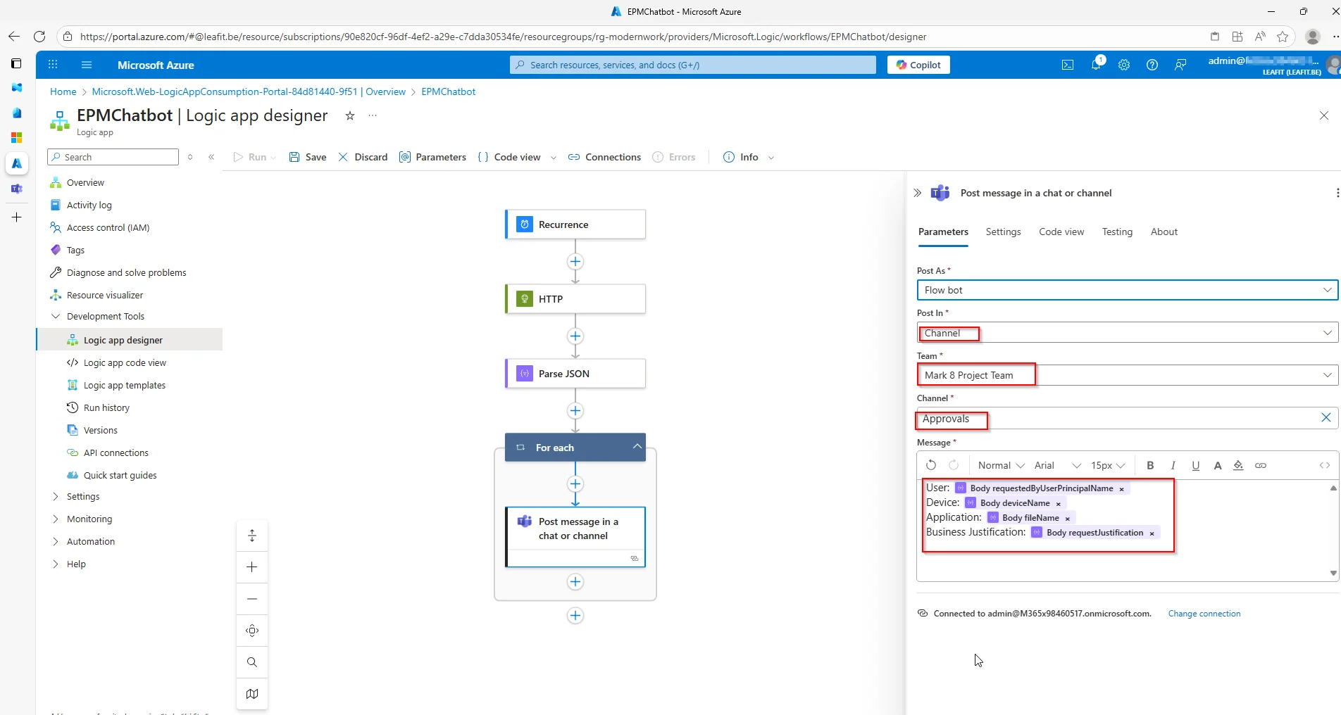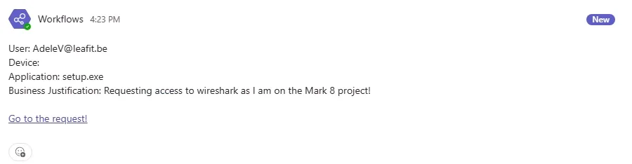 To achieve this, we use Azure Logic Apps to automate the process of sending a message to a Microsoft Teams channel the moment a request is made. The Logic App listens for elevation request events and posts a structured message (containing details like the user, device, application, and justification) directly into a designated Teams channel.