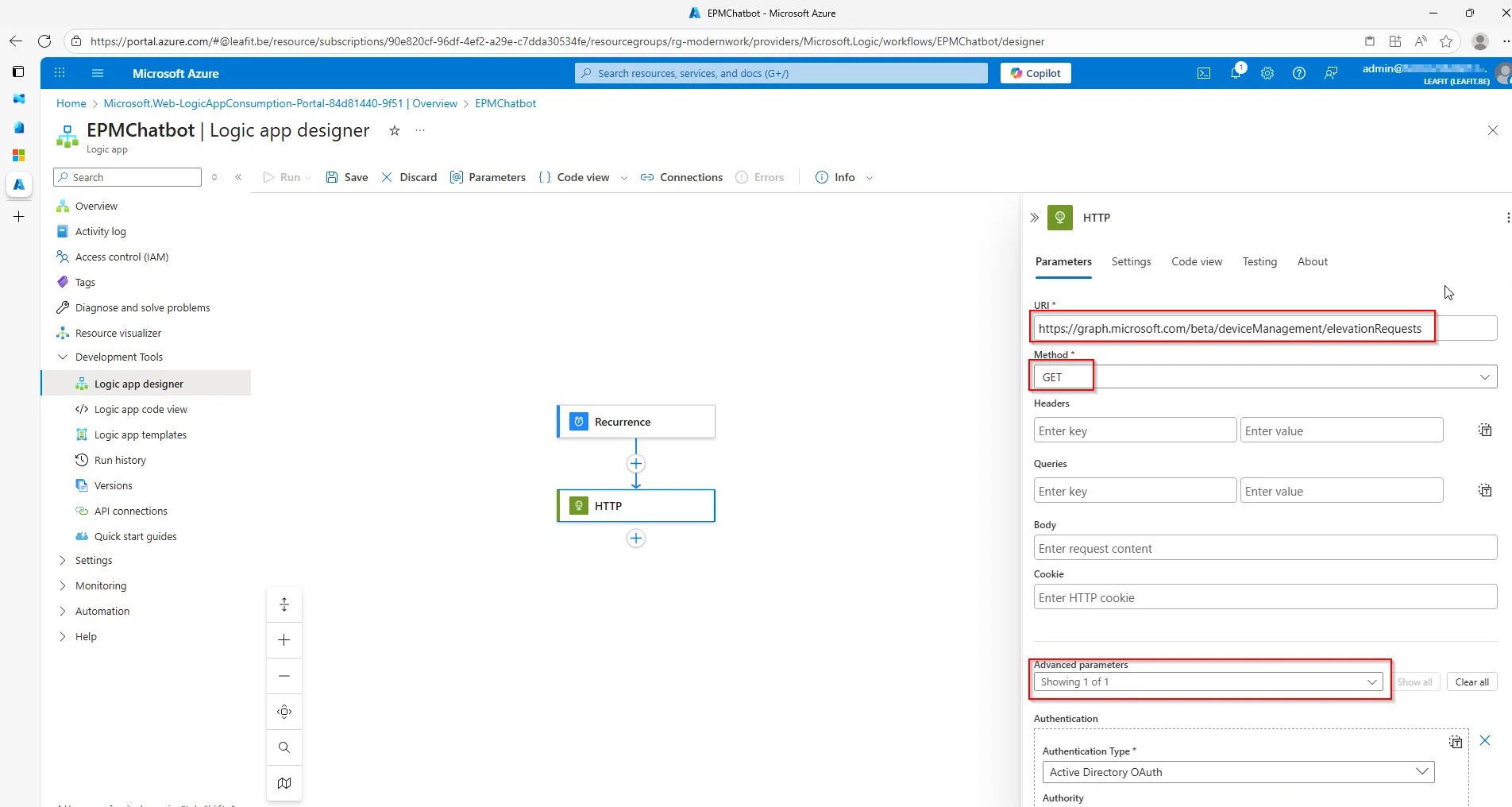Afterwards, we will collect the data from the GraphAPI. Using the information we used in our test with the Graph Explorer. It is important here to also configure Authentication under the âAdvanced parametersâ. Otherwise, the Logic app will not have access to the right permissions.